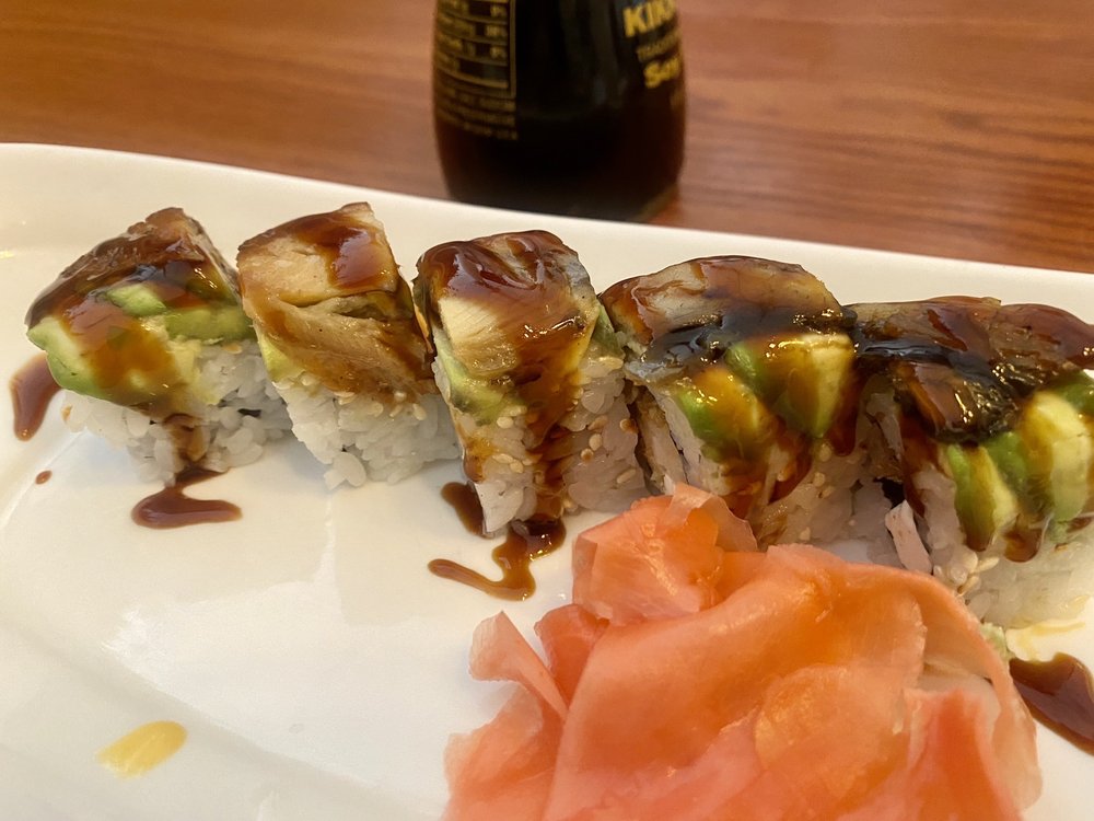 Shrimp Tempura and Cream Cheese, topped with Eel, Avocado and Eel Sauce